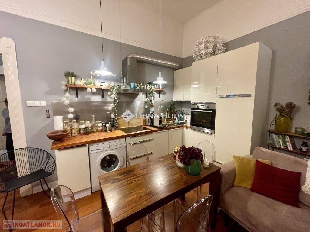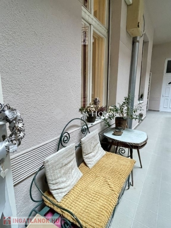 Az ingatlan egy frissen felújított belső udvaros ház 1. emeletén található. Bár a lakás a körfolyosóról nyílik, elhelyezkedése miatt nincs előtte átmenő forgalom, így a bejárat előtti rész egy privát, paddal és asztallal berendezett teraszként funkcionál – tökéletes helyszín a reggeli kávéhoz.