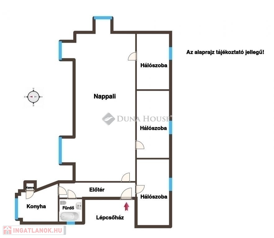 A beosztás praktikus: a három háló külön nyílik, a terek világosak. Bár az ingatlan lakható állapotú, kiváló alap arra, hogy saját stílusodra formáld.