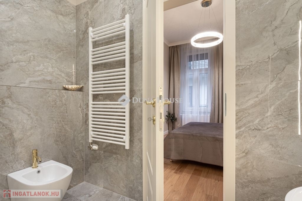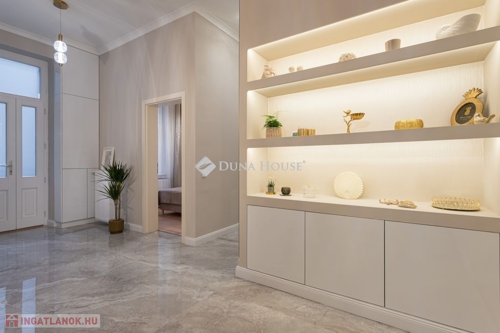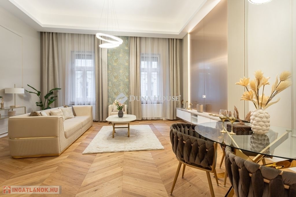 Eladó az V. kerületben, a Szent István körúton, két utcányira a Dunától egy 86 m²-es, 3. emeleti, utcai nézetű, nappali + 2 hálószobás, 2 fürdős, gardróbos luxuslakás.