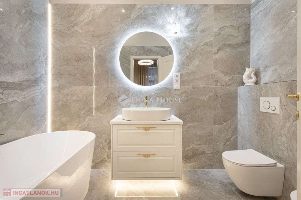 A lakás magas belmagasságú, chevron parkettás, modern gépesítéssel (Daikin klíma, Bosch kazán, AEG gépek), új vezetékekkel és nyílászárókkal. A tágas amerikai konyhás nappali napfényes és elegáns, mindkét hálószoba saját fürdőszobás (egyik káddal, másik zuhannyal).