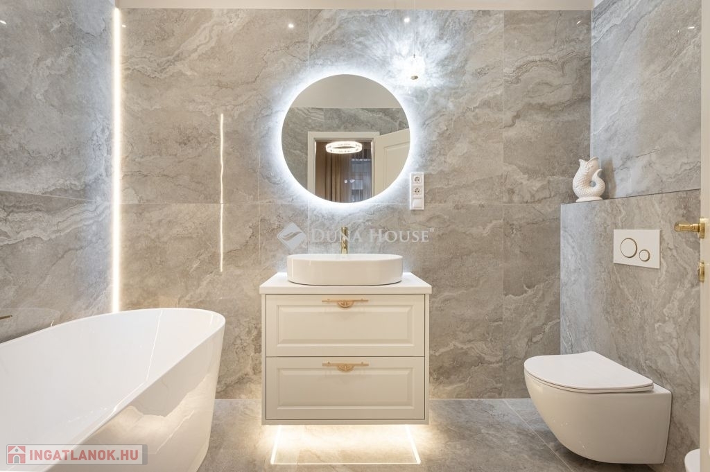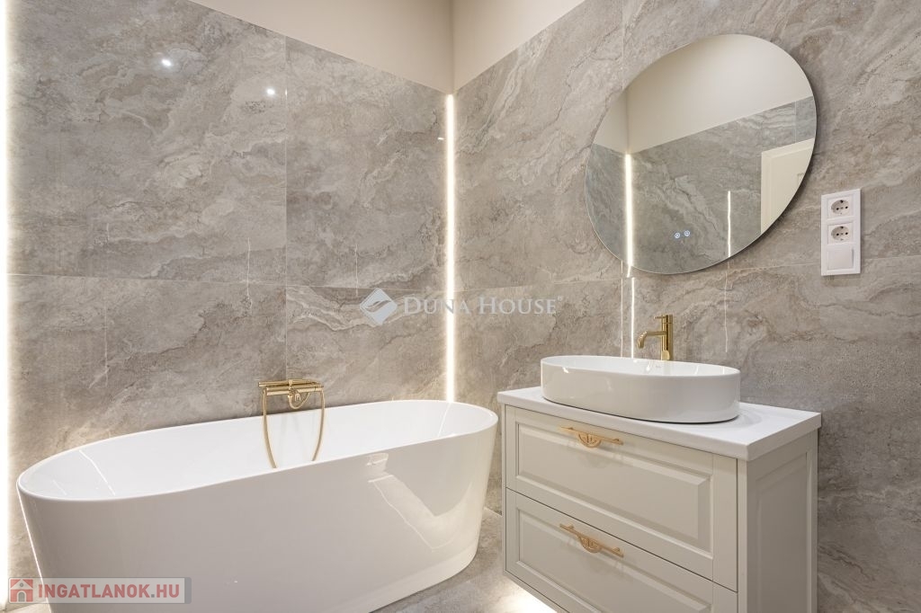 A tágas, napfényes amerikai konyhás nappali impozáns megjelenését designer világítás, minőségi anyagok és az arányosan kialakított terek adják. A két hálószoba saját fürdővel rendelkezik az egyik káddal, a másik zuhanykabinnal felszerelt.