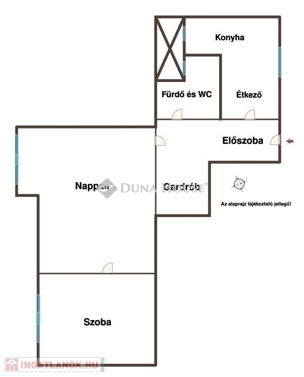 A jelenlegi elosztás: étkezős konyha, tágas nappali, külön hálószoba és fürdő jól használható, de igény szerint könnyen átalakítható.
