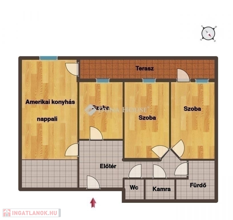 Az átgondolt tervezésnek köszönhetően a 82 m2-es alapterületen a 28 m2-es amerikai konyhás nappali és a három, teljes értékű hálószoba mellett egy normál méretű fürdőszoba, egy plusz külön wc és egy kamra (tároló) is helyet kapott.