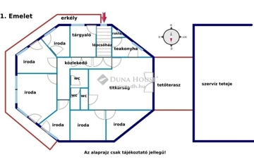 Az 1.700 m2 összterületű, 4 szintes épület hatalmas, 4.500 m2-es telken áll, ahol 60 db személygépkocsi parkoló van. A terület mérete lehetővé teszi kamion behajtását is. Az 1995-ben épült ingatlan mind műszakilag, mind esztétikailag kiváló állapotban van, az évek során folyamatosan felújították, korszerűsítették. Műanyag nyílászárók, pótlólagos szigetelés, légkondicionáló.